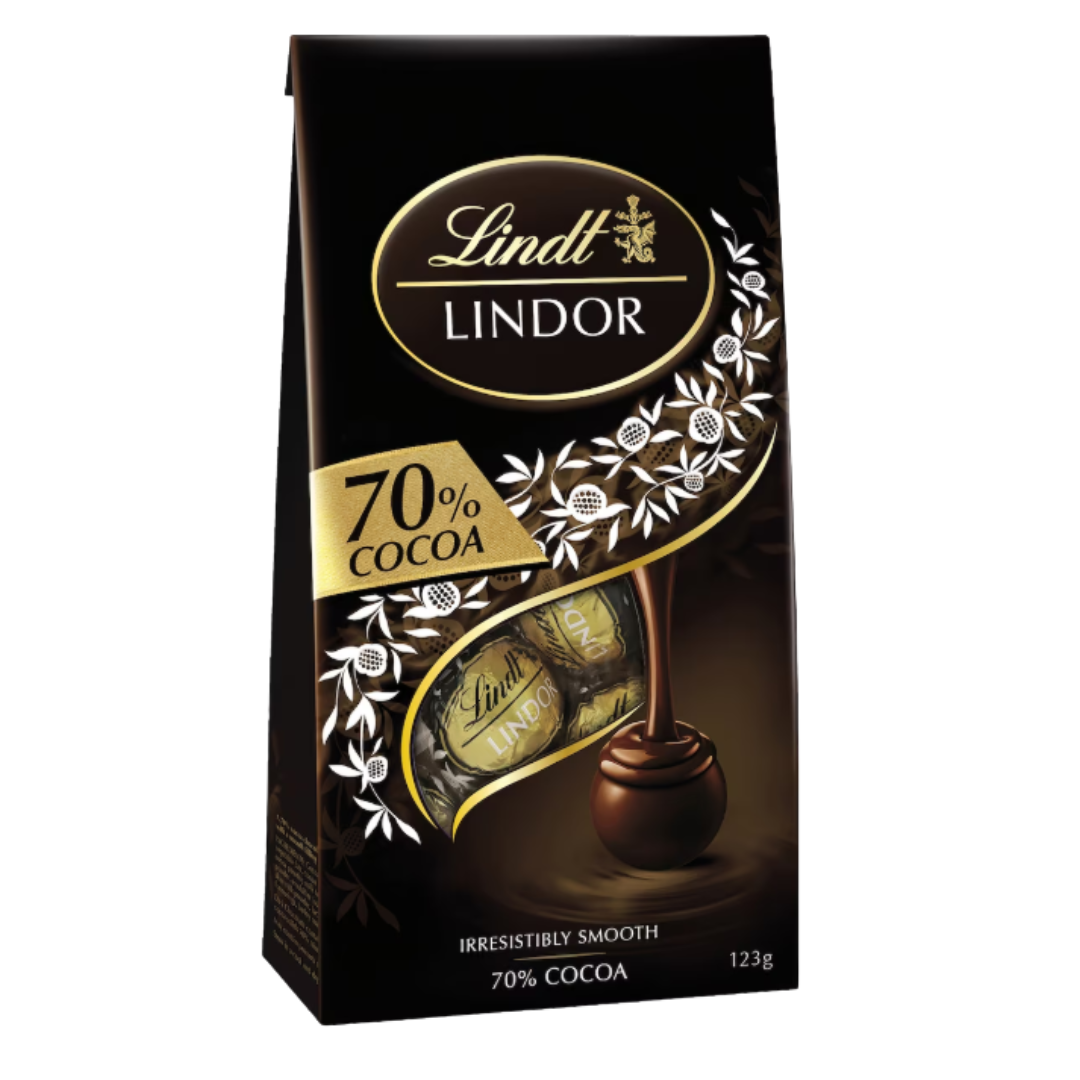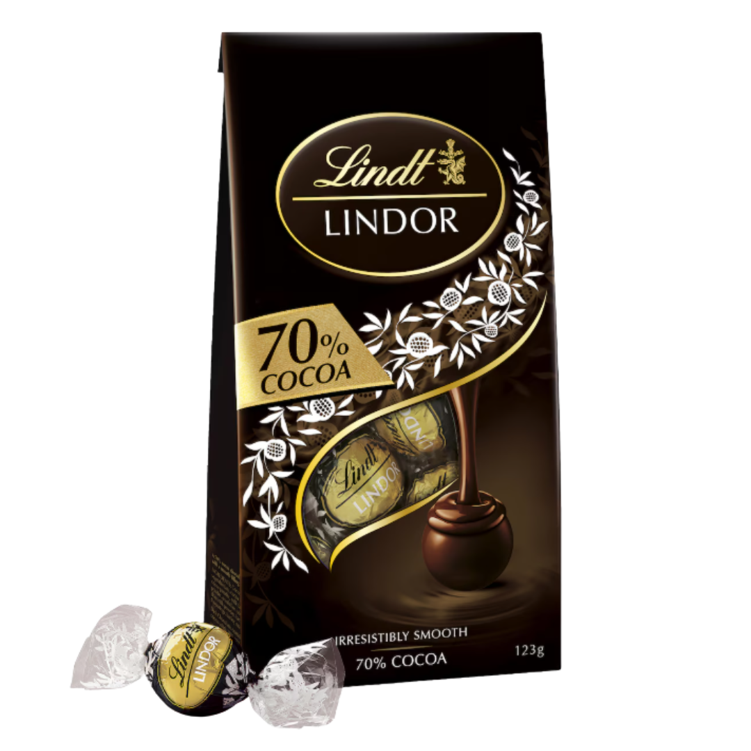 Product form Lindt Lindor • 125g dark choc bag $15.00 Lindt LINDOR Smooth melting 70% cocoa truffles 125g bag Read more Read more Add to cart This item is a recurring or deferred purchase. By continuing, I agree to the cancellation policy and authorize you to charge my payment method at the prices, frequency and dates listed on this page until my order is fulfilled or I cancel, if permitted. Share with your friends Share Deel X Messenger Email Description Lindt LINDOR Smooth melting 70% cocoa truffles 125g bag